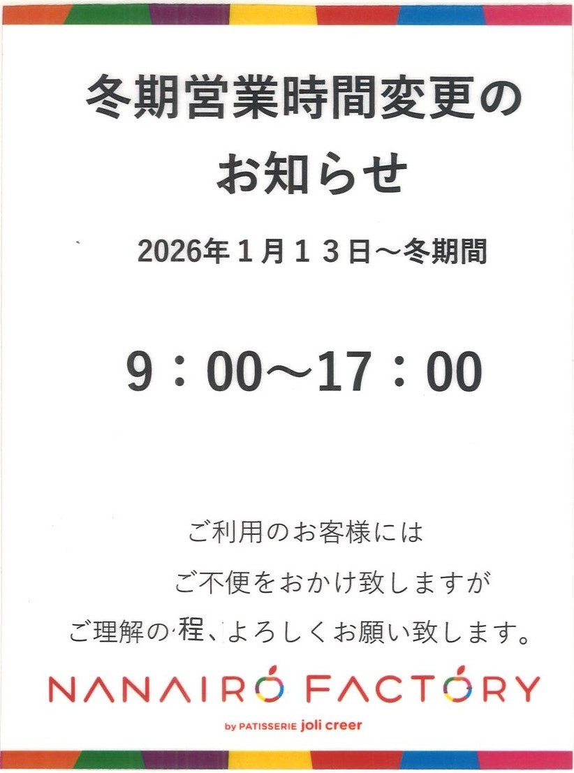 【 テナント『甲』 『NANAIRO FACTORY』時間短縮営業のお知らせ 】