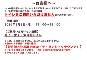 トイレ内設備工事のため、下記日程はトイレをご利用いただけませんのでご注意下さい。